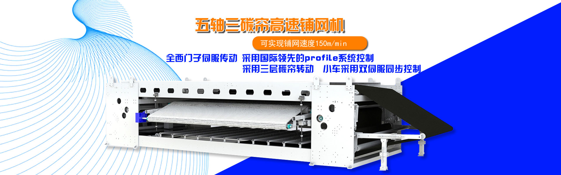 現(xiàn)公司主要供應(yīng)設(shè)備:開包機(jī)、開松機(jī)、混棉機(jī)、給棉機(jī)、梳理機(jī)、鋪網(wǎng)機(jī)、氣流成網(wǎng)機(jī)、牽伸機(jī)、針刺機(jī)、起絨機(jī)、提花機(jī)、水刺機(jī)、熱熔烘箱、噴膠紡絲棉烘箱、收卷機(jī)……其中針刺機(jī)最寬11m,梳理機(jī)最寬3.5m,鋪網(wǎng)機(jī)速度130m/min;
